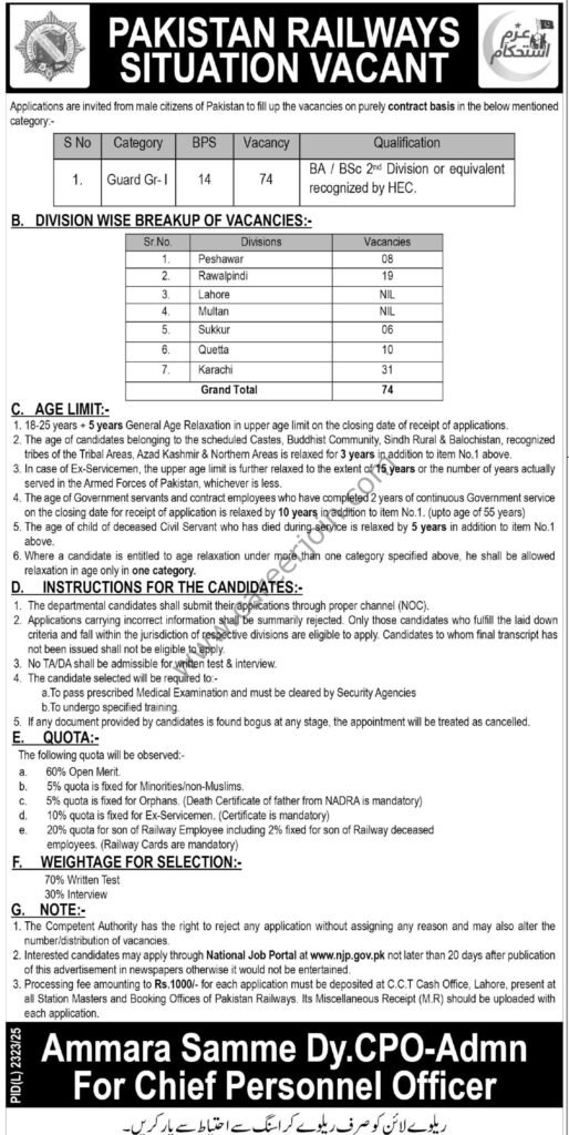 To apply for Pak Railway Jobs, candidates must meet the following conditions: