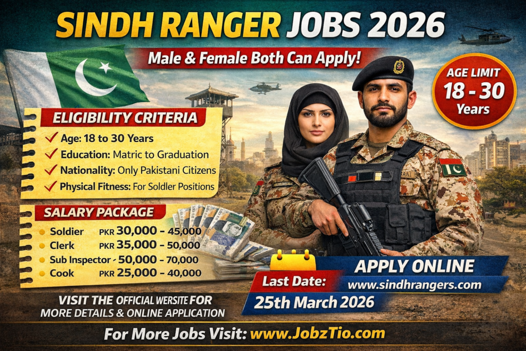 If you’re looking for a challenging and rewarding career in Pakistan’s prestigious security forces, Sindh Ranger Jobs 2026 may be the perfect opportunity for you. The Sindh Rangers, known for their crucial role in maintaining law and order, are offering multiple job vacancies for individuals passionate about serving the nation. These roles span a variety of positions, from Soldier to Clerk and Sub Inspector, offering opportunities for both fresh graduates and experienced professionals.